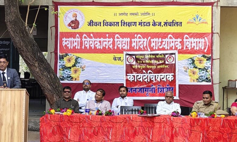 केज:-: दि. २७ नोव्हेंबर- जीवन विकास शिक्षण मंडळ केज संचलित, स्वामी विवेकानंद विद्यामंदिर माध्यमिक विभाग या शाळेमध्ये संविधान दिनाचे औचित्य साधून तालुका विधी सेवा समिती तसेच विधीज्ञ संघ केज यांच्या संयुक्त विद्यमाने दि. २६ नोव्हेंबर २०२४ रोजी कायदेविषयक जनजागृती शिबिर आयोजन करण्यात आले. याप्रसंगी कार्यक्रमाचे अध्यक्ष श्री. के. डी. जाधव, जिल्हा व अती, सत्र न्यायाधीश केज हे उपस्थित होते. तर प्रमुख उपस्थितीमध्ये श्री. एल. बी. बेडसकर, गटशिक्षणाधिकारी केज श्री. ए. एस. राठोड, सहा. गटविकास अधिकारी केज ॲड. डी. टी. सपाटे, ॲड. ए. जे. देवधारे, ॲड. एस. एन. मुंडे, ॲड. एस. व्ही. मिसळे व विधीज्ञ सदस्य तसेच  संस्थेचे  सचिव गिन्यानदेव गदळे सचिव, जीवन विकास शिक्षण मंडळ केज, शाळेच्या मुख्याध्यापिका सौ. शिवनंदा मुळे आदी उपस्थित होते.