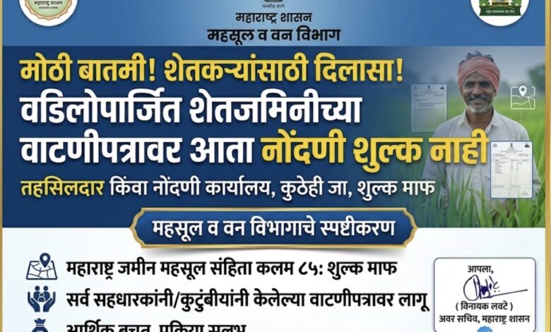 शेतकऱ्यांना मोठा दिलासा! वडिलोपार्जित शेतजमिनीच्या वाटणीपत्राच्या नोंदणीवर आकारले जाणारे नोंदणी शुल्क पूर्णपणे माफ